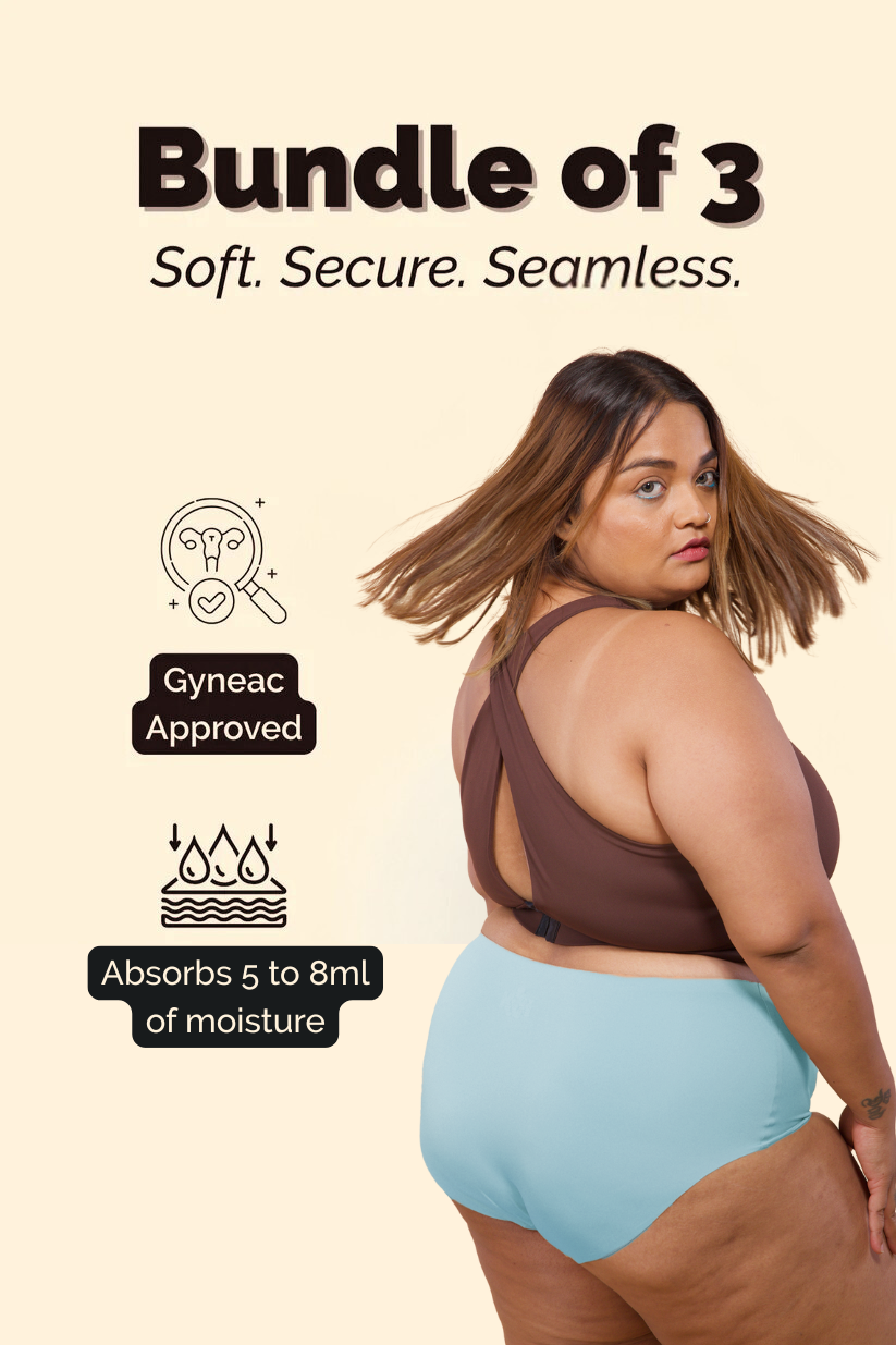 This baby blue seamless Tilt undie is completely free of panty lines! It also features our specialized gynaec-recommended and patented absorbent lining that keeps you dry all day