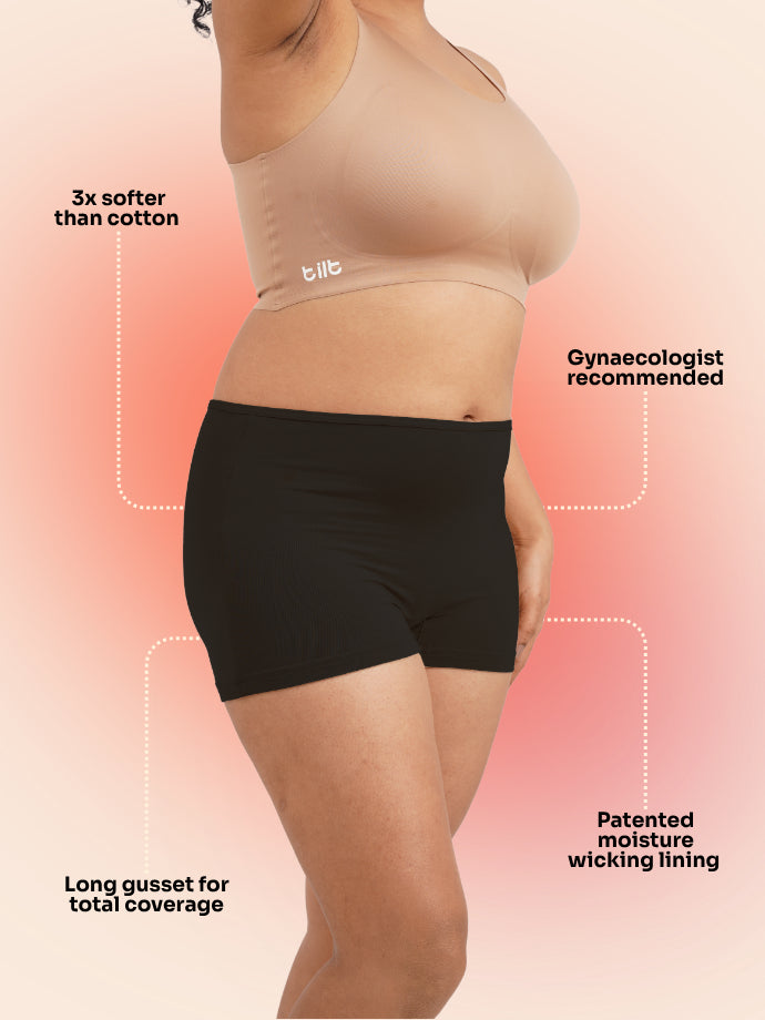 Pack of 3! These black Tilt boyshorts underwear features our specialized gynaec-recommended and patented absorbent lining. Wicks light leaks, discharge, and keeps you dry all day. Absorbs upto 5-8ml in every use.